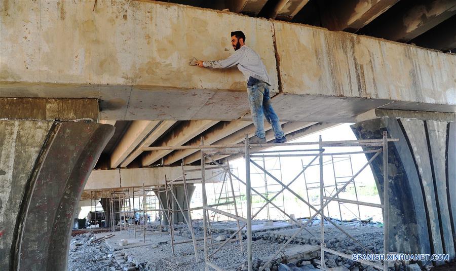 ALEPO, junio 9, 2018 (Xinhua) -- Imagen del 6 de junio de 2018 de una parte del Puente al-Haj bajo reconstrucción, en Alepo, Siria. Aproximadamente el 70 por ciento de las instalaciones de infraestructura de la ciudad de Alepo, en el norte de Siria, han sido reconstruidas desde que la ciudad fue completamente recuperada por el ejército sirio a finales de 2016. (Xinhua/Ammar Safarjalani)
