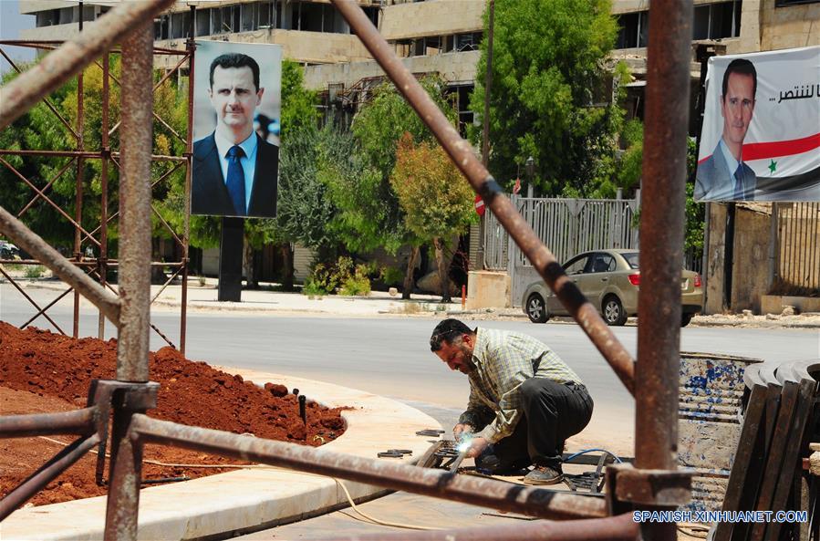 ALEPO, junio 9, 2018 (Xinhua) -- Imagen del 6 de junio de 2018 de un hombre trabajando en la rotonda Saba'a Bahrat, en Alepo, Siria. Aproximadamente el 70 por ciento de las instalaciones de infraestructura de la ciudad de Alepo, en el norte de Siria, han sido reconstruidas desde que la ciudad fue completamente recuperada por el ejército sirio a finales de 2016. (Xinhua/Ammar Safarjalani)