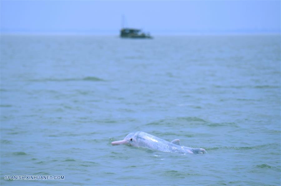 GUANGXI, junio 11, 2018 (Xinhua) -- Imagen del 10 de junio de 2018 de un delfín blanco de China jugueteando en el área marítima de Sanniangwan, en la ciudad de Qinzhou, Región Autónoma Zhuang de Guangxi, en el sur de China. (Xinhua/Zhou Hua)