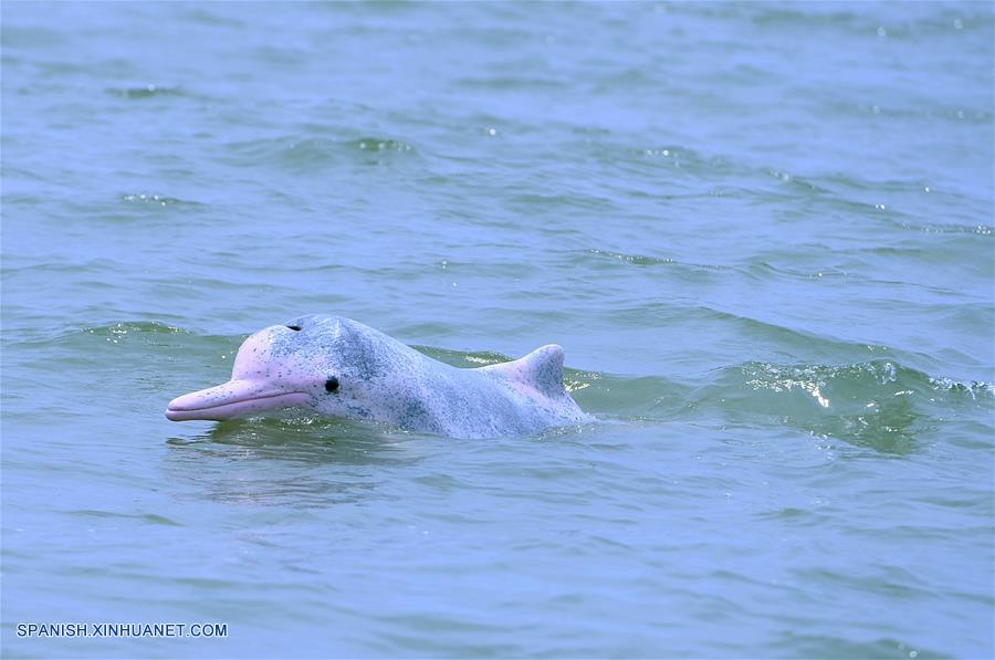 GUANGXI, junio 11, 2018 (Xinhua) -- Imagen del 10 de junio de 2018 de un delfín blanco de China jugueteando en el área marítima de Sanniangwan, en la ciudad de Qinzhou, Región Autónoma Zhuang de Guangxi, en el sur de China. (Xinhua/Zhou Hua)