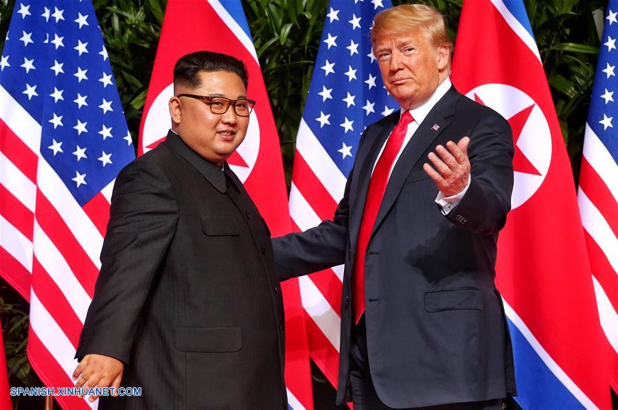 El máximo líder de la República Popular Democrática de Corea (RPDC), Kim Jong Un (i) se reúne con el presidente de Estados Unidos, Donald Trump (d), en Singapur, capital de Singapur, el 12 de junio de 2018. (Xinhua/The Straits Times)