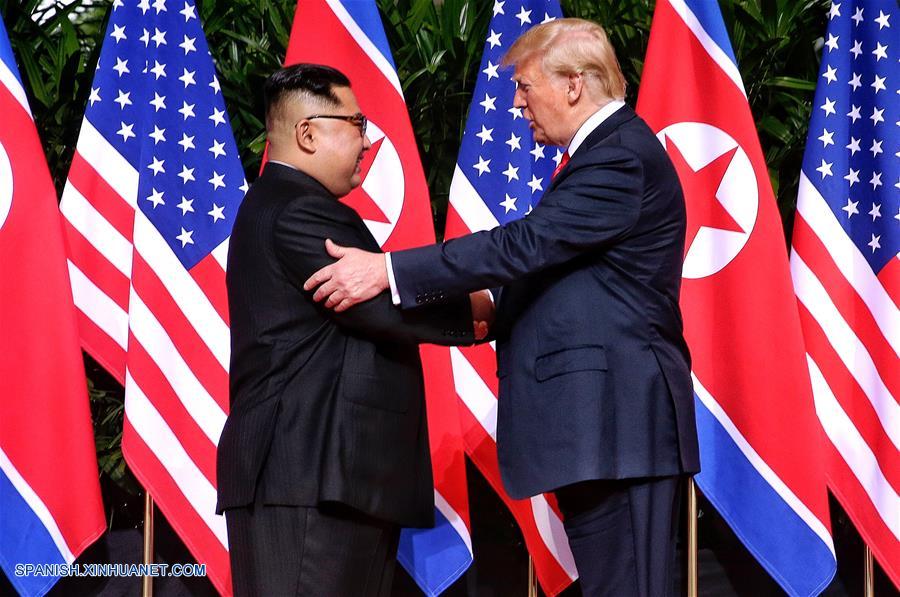 El máximo líder de la República Popular Democrática de Corea (RPDC), Kim Jong Un (i) estrecha la mano con el presidente de Estados Unidos, Donald Trump (d), en Singapur, capital de Singapur, el 12 de junio de 2018. (Xinhua/The Straits Times)