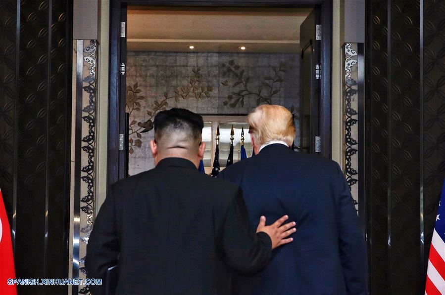 SINGAPUR, junio 12, 2018 (Xinhua) -- El máximo líder de la República Popular Democrática de Corea (RPDC), Kim Jong Un (i), y el presidente de Estados Unidos, Donald Trump (d), se retiran después de firmar una declaración conjunta, en la ciudad de Singapur, capital de Singapur, el 12 de junio de 2018. (Xinhua/Ministerio de Comunicación e Información de Singapur)