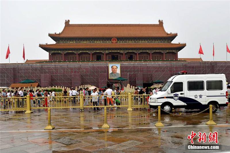 Andamios y vallas cubren la tribuna de la Plaza de Tian'anmen, justo antes de la conmemoración del 70 aniversario de la victoria en la guerra de resistencia contra la agresión japonesa, 12 de julio del 2015.