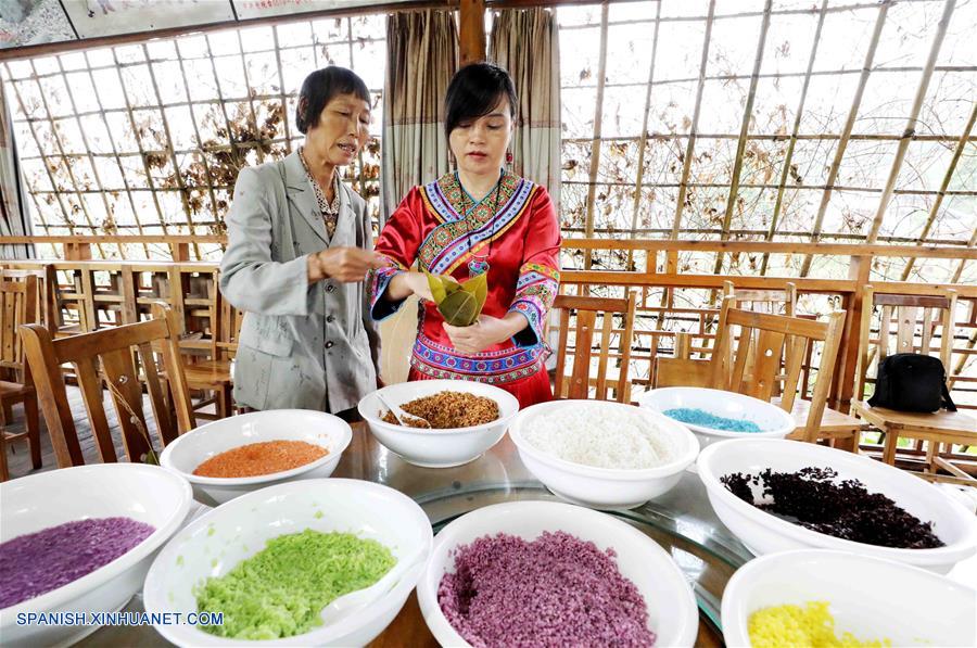 GUANGXI, junio 12, 2018 (Xinhua) -- Residentes elaboran colorido Zongzi, bolas de masa hervida en forma de pirámide hechas de arroz glutinoso envuelto en hojas de bambú o de ca?a, para saludar al próximo Festival de Botes de Dragón, en el condado de Rong'an, capital de la Región Autónoma Zhuang de Guangxi, en el sur de China, el 12 de junio de 2018. (Xinhua/Tan Kaixing)