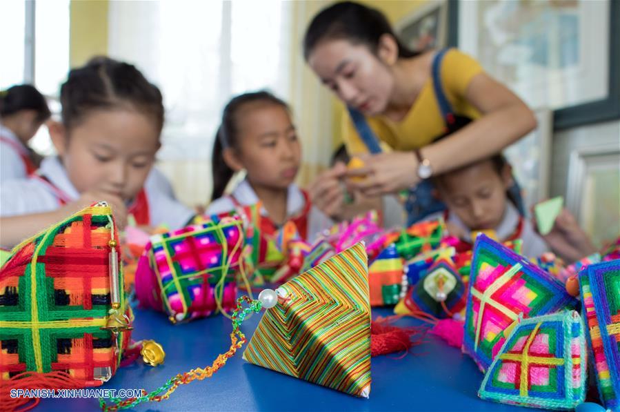 HOHHOT, junio 12, 2018 (Xinhua) -- Alumnos elaboran bolsitas en forma de Zongzi, bolas de masa hervida en forma de pirámide hechas de arroz glutinoso envuelto en hojas de bambú o de ca?a, para saludar al próximo Festival de Botes de Dragón, en una escuela primaria en Hohhot, capital de la Región Autónoma de Mongolia Interior, en el norte de China, el 12 de junio de 2018. (Xinhua/Ding Genhou)