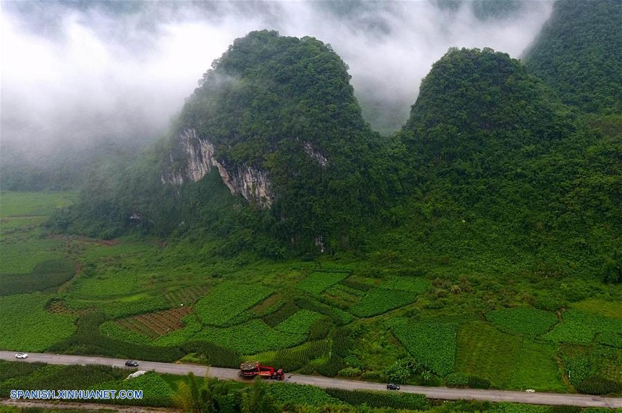 GUANGXI, junio 12, 2018 (Xinhua) -- Un camión que transporta el tambor de bronce gigante se deplaza a través una carretera de monta?a en el Condado Autónomo Maonan de Huanjiang, en la Región Autónoma Zhuang de Guangxi, en el sur de China, el 12 de junio de 2018. El diámetro del tambor es de más de seis metros. Este será transportado a la Plaza Huazhumao en Huanjiang. (Xinhua/Gao Dongfeng)