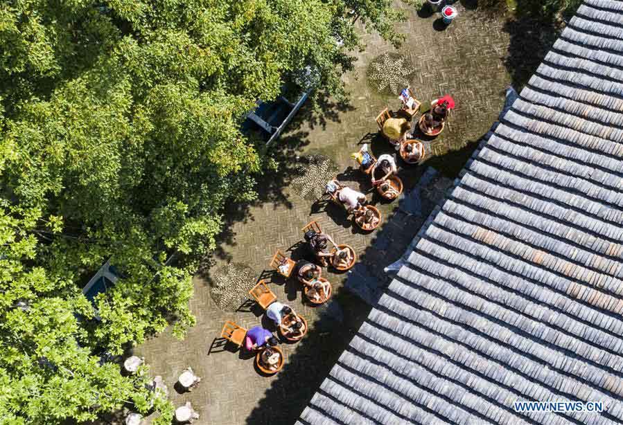 Los ni?os se ba?an con agua de artemisa china en el condado Zigui, provincia de Hubei, en China central, el 12 de junio de 2018. El martes se celebró una actividad tradicional de Zigui para dar la bienvenida al próximo Festival del Bote de Dragón. (Xinhua / Wang Aiping)