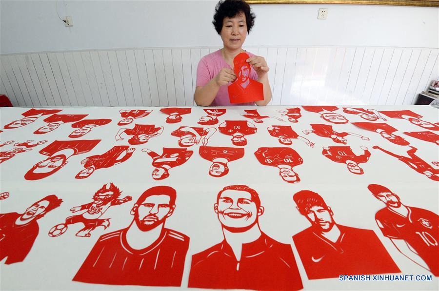 HANDAN, junio 12, 2018 (Xinhua) -- La artesana Feng Shiping elabora trabajos de papel picado para saludar a la próxima Copa Mundial de la FIFA Rusia 2018, en Handan, provincia de Hebei, en el norte de China, el 12 de junio de 2018. (Xinhua/Hao Qunying)
