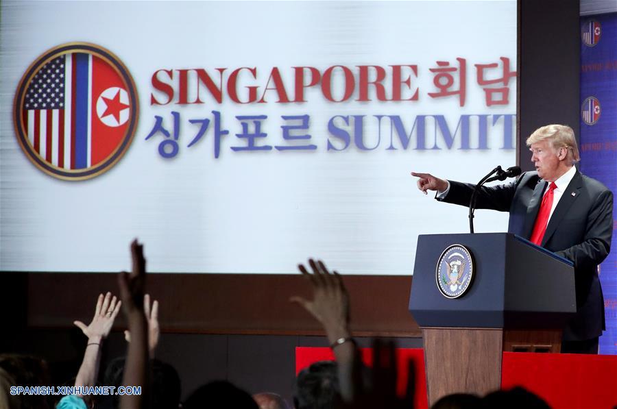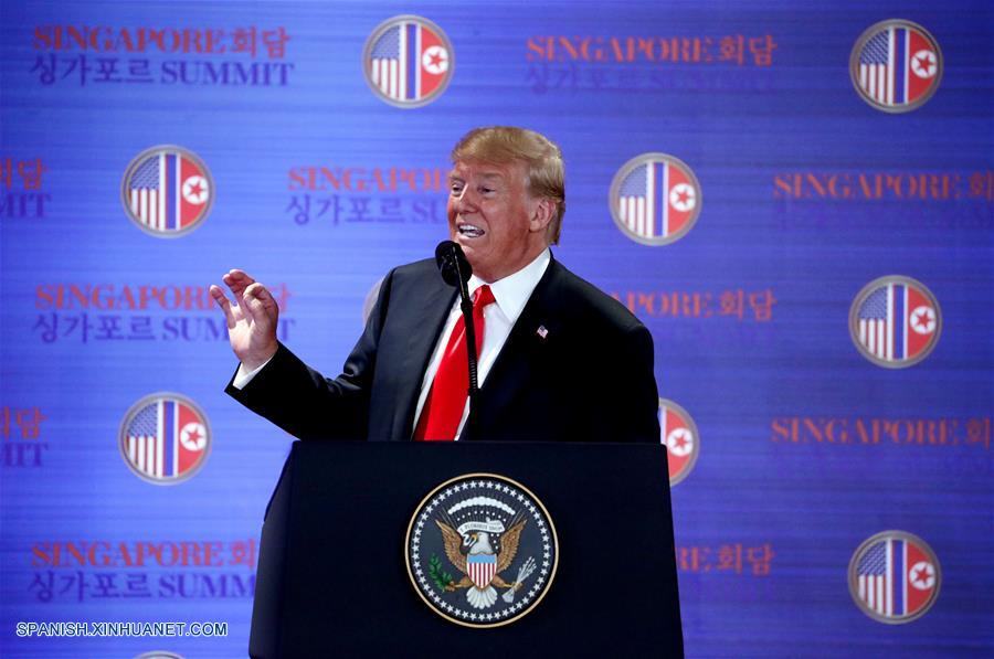 SINGAPUR, 12 jun (Xinhua) -- El presidente de Estados Unidos, Donald Trump, dijo el martes tras su histórica cumbre con Kim Jong Un, el máximo líder de la República Popular Democrática de Corea (RPDC), que su país dejará de llevar a cabo ejercicios militares con la República de Corea.
