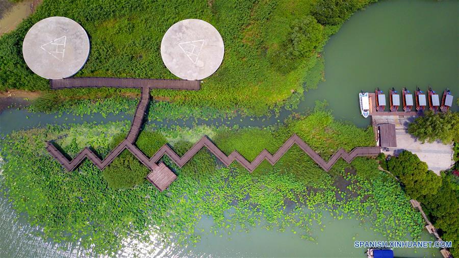 JIANGSU, junio 12, 2018 (Xinhua) -- Imagen del 11 de junio de 2018 de una vista aérea de un paisaje del Lago Taihu, en la ciudad de Suzhou, provincia de Jiangsu, en el este de China. (Xinhua/Str)