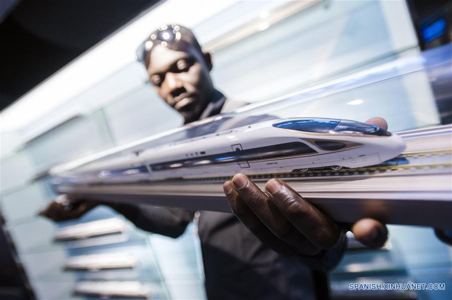 Un ejecutivo ferroviario de Ghana observa un modelo de tren bala Fuxing, en una base de entrenamiento para el personal del ferrocarril de alta velocidad, en Wuhan, provincia de Hubei, en el centro de China, el 12 de junio de 2018. En total 63 ejecutivos ferroviarios de 13 países incluyendo Tailandia, Sri Lanka y Laos visitaron el martes la base de entrenamiento. (Xinhua/Xiao Yijiu)