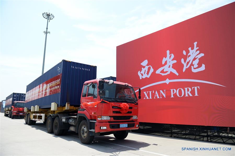 SHAANXI, junio 13, 2018 (Xinhua) -- Vehículos importados traídos por un tren carguero son transportados fuera de la terminal de contenedores, en Xi'an, provincia de Shaanxi, en el noroeste de China, el 13 de junio de 2018. Habiendo partido de Gante, Bélgica, al tren le tomó 16 días transportar un total de 160 vehículos Volvo, cubriendo una distancia de más de 10,000 kilómetros. (Xinhua/Li Yibo)