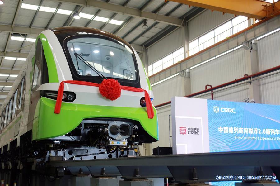Vista del tren de levitación magnética (maglev) de nueva generación de velocidad media-baja de fabricación nacional, en la Compa?ía de Locomotoras de Zhuzhou CRRC, en Zuzhou, en la provincia de Hunan en el centro de China, el 13 de junio de 2018. (Xinhua/Str)