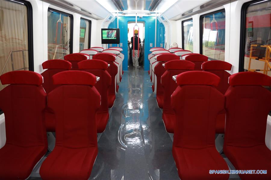 HUNAN, junio 13, 2018 (Xinhua) -- Vista del interior del tren de levitación magnética (maglev) de nueva generación de velocidad media-baja de fabricación nacional, en la Compa?ía de Locomotoras de Zhuzhou CRRC, en Zuzhou, en la provincia de Hunan, en el centro de China, el 13 de junio de 2018. Un tren de levitación magnética (maglev) de nueva generación de velocidad media-baja salió de la línea de montaje el miércoles en la provincia de Hunan. El tren puede alcanzar los 160 kilómetros por hora, considerablemente más que los 100 kilómetros por hora de la primera generación. (Xinhua/Str)