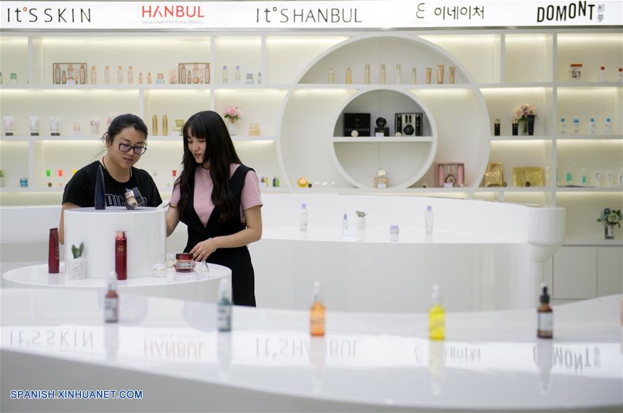 ZHEJIANG, junio 14, 2018 (Xinhua) -- Personas observan los artículos en una empresa de cosméticos, en la localidad de Daixi de la ciudad de Huzhou, provincia de Zhejiang, en el este de China, el 14 de junio de 2018. Localizada en la zona monta?osa del norte de Zhejiang, la localidad de Daixi ha atraído a muchas empresas famosas de cosméticos para establecerse desde 2015. (Xinhua/Weng Xinyang)