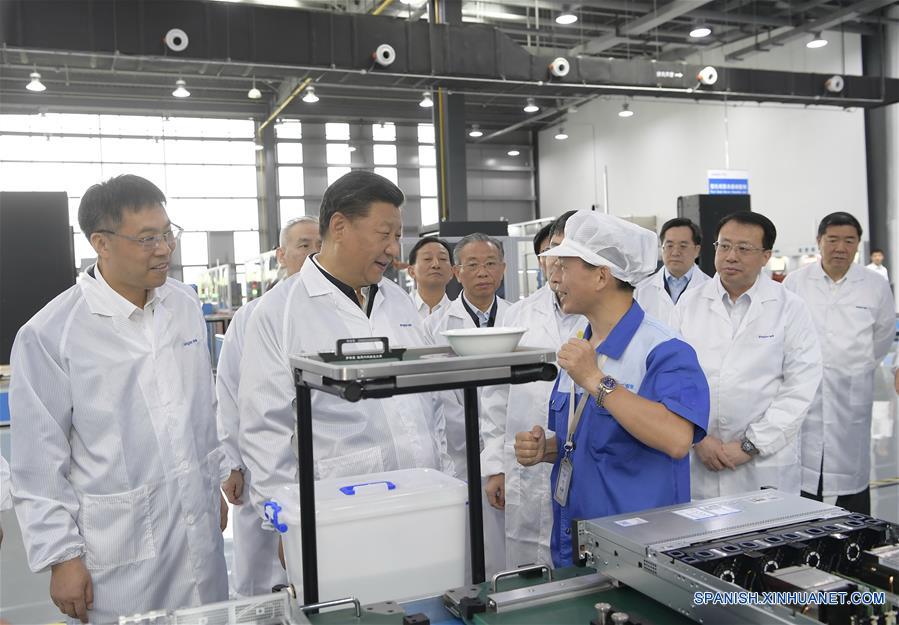 SHANDONG, junio 14, 2018 (Xinhua) -- El presidente de China, Xi Jinping, también secretario general del Comité Central del Partido Comunista de China (PCCh) y presidente de la Comisión Militar Central, visita una base de producción de computadoras de alta gama tolerantes a fallas del Grupo Inspur en la zona de alta tecnología de Jinan, capital de la provincia de Shandong, en el este de China, el 14 de junio de 2018. Xi Jinping realizó una gira de inspección en Shandong del 12 al 14 de junio. (Xinhua/Li Xueren)