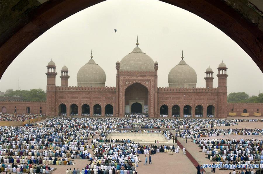 Musulmanes pakistaníes ofrecen oraciones del Eid al-Fitr en la Mezquita Badshahi, un Sitio Patrimonio de la Organización de las Naciones Unidas para la Educación, la Ciencia y la Cultura (UNESCO), en Lahore, en el este de Pakistán, el 16 de junio de 2018. (Xinhua/Sajjad)
