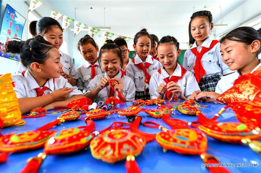 Imagen del 15 de junio de 2018 de ni?as aprendiendo a elaborar sacos durante una actividad llevada a cabo para celebrar el próximo Festival de Botes de Dragón, en la escuela primaria Beibao en la ciudad de Handan, provincia de Hebei, en el norte de China. (Xinhua/Wang Xiao)