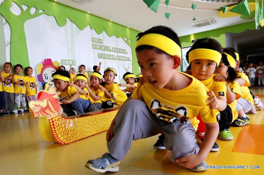 Imagen del 15 de junio de 2018 de ni?os jugando con botes de dragón hechos de cajas durante un evento llevado a cabo para celebrar el próximo Festival de Botes de Dragón, en un jardín de ni?os en Suzhou, provincia de Jiangsu, en el este de China. (Xinhua/Wang Jianzhong)