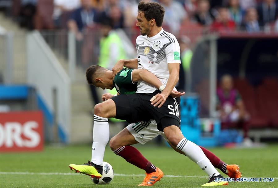 El jugador Mats Hummels (frente), de Alemania, disputa el balón con Javier Hernández (atrás), de México, durante el partido del Grupo F de la Copa Mundial de la FIFA Rusia 2018, en Moscú, Rusia, el 17 de junio de 2018. (Xinhua/Xu Zijian)