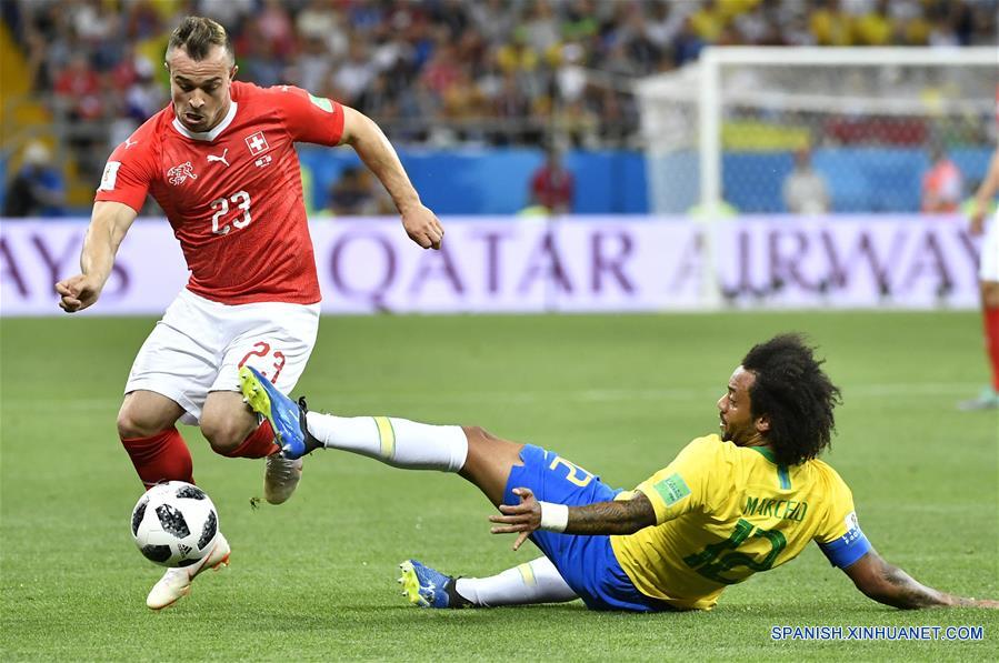 El jugador Marcelo (d), de Brasil, disputa el balón con Xherdan Shaqiri (i), de Suiza, durante el partido del Grupo E de la Copa Mundial de la FIFA Rusia 2018, en Rostov del Don, Rusia, el 17 de junio de 2018. (Xinhua/Chen Yichen)