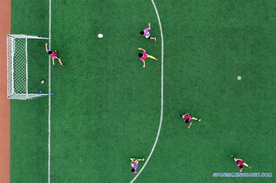 Alumnos compiten durante un partido de fútbol en la Escuela Primaria de Arte de Beixin durante el tercer día del feriado de tres días por el Festival del Bote del Dragón, en el condado de Ningjin, provincia de Hebei, en el norte de China, el 18 de junio de 2018. (Xinhua/Chen Lei)