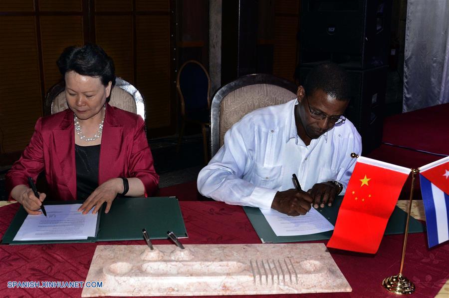 El vicepresidente de la Cámara de Comercio de Cuba, Rubén Ramos (d), y la presidenta del comité provincial de Zhejiang del Consejo Chino para la Promoción del Comercio Internacional (CCPIT, siglas en inglés), Wu Guiying (i), firman un memorando de entendimiento en el Hotel Nacional de La Habana, en La Habana, Cuba, el 18 de junio de 2018. Representantes de la Cámara de Comercio de Cuba y del comité provincial del Consejo Chino para la Promoción del Comercio Internacional (CCPIT, siglas en inglés) de Zhejiang, firmaron el lunes un memorando de entendimiento para fortalecer las relaciones de intercambio y colaboración económica. (Xinhua/Joaquín Hernández)