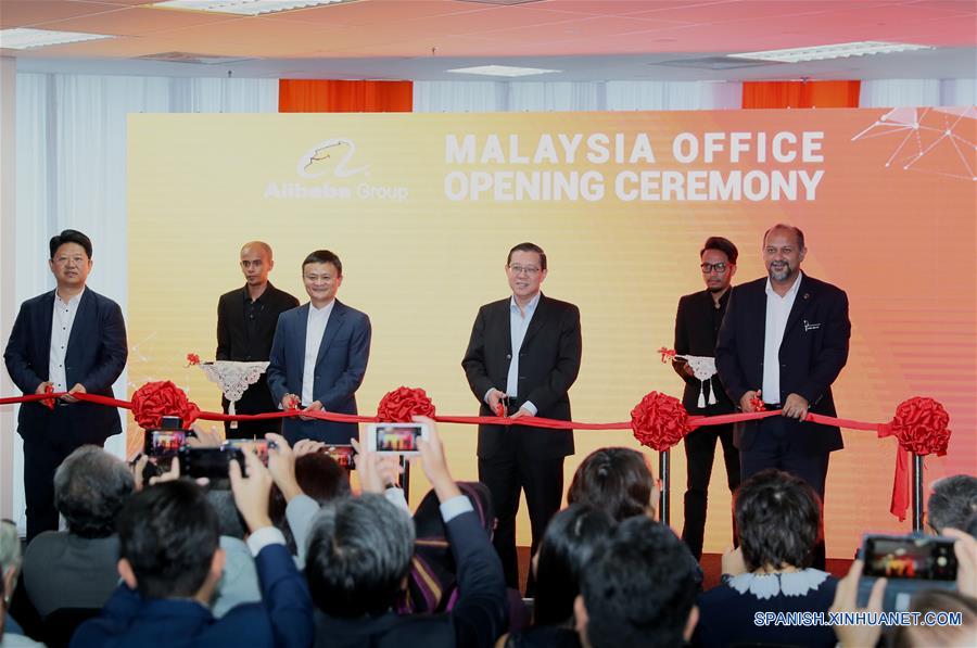 El fundador y presidente ejecutivo de Alibaba, Jack Ma (2-i-frente), el ministro malayo de Finanzas, Lim Guan Eng (2-d-frente), el ministro malayo de Comunicaciones y Multimedios, Gobind Singh Deo (d-frente) y el embajador de China en Malasia, Bai Tian (i-frente), cortan el listón en la apertura de una oficina de Alibaba en Malasia, en Kuala Lumpur, Malasia, el 18 de junio de 2018. De acuerdo con información de la prensa local, la nueva oficina en Malasia del Grupo Alibaba comenzó a operar el lunes, mientras el gigante chino de la tecnología continúa su expansión en el extranjero en la región del sureste asiático. (Xinhua/Zhu Wei)