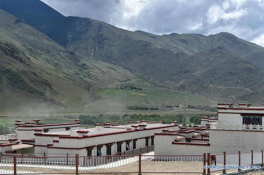 Vista de residencias construidas para aldeanos que han sido reubicados desde el condado Nyima de Nagqu a un nuevo asentamiento en Lhasa, durante un programa de reubicación con el objetivo de proteger el medio ambiente, en Lhasa, Región Autónoma del Tibet, en el sureste de China, el 18 de junio de 2018. Un total de 1,102 residentes fueron reubicados a un nuevo asentamiento en Lhasa para volver accesibles sus antiguos vecindarios para animales salvajes en la Reserva Nacional Natural de Qiangtang. Finalizada el lunes, esta reubicación forma parte del primer programa llevado a cabo a favor de la protección del medio ambiente en áreas de gran altitud de la Región Autónoma del Tibet, en el sureste de China. (Xinhua/Chogo)