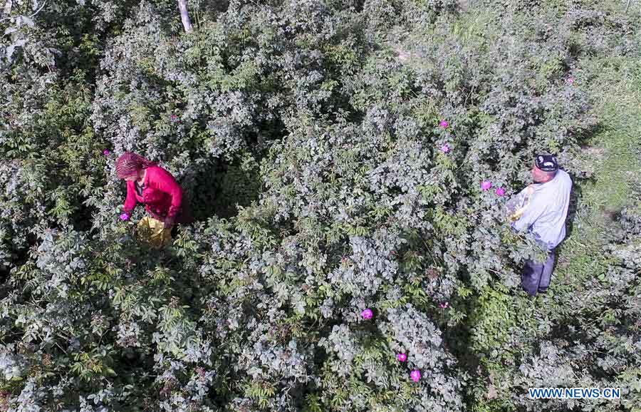 Ruz y su esposa Tajinisa recolectan pétalos, provientes de las rosas que han cultivado. Los aldeanos de Hotan son buenos elaborando la famosa salsa rosa, un producto que les genera importantes ingresos. Aldea Hotan, Región Autónoma de Xinjiang Uygur, 6 de junio del 2018 (Foto: Xinhua/ Zhao Ge)