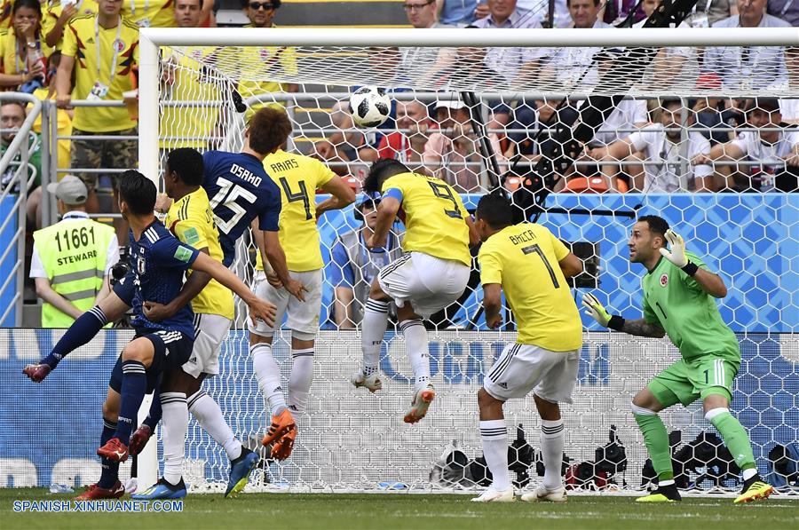 El jugador Yuya Osako (3-i), de Japón, realiza una anotación durante el partido del Grupo H de la Copa Mundial de la FIFA Rusia 2018, ante Colombia, en Saransk, Rusia, el 19 de junio de 2018. (Xinhua/He Canling)