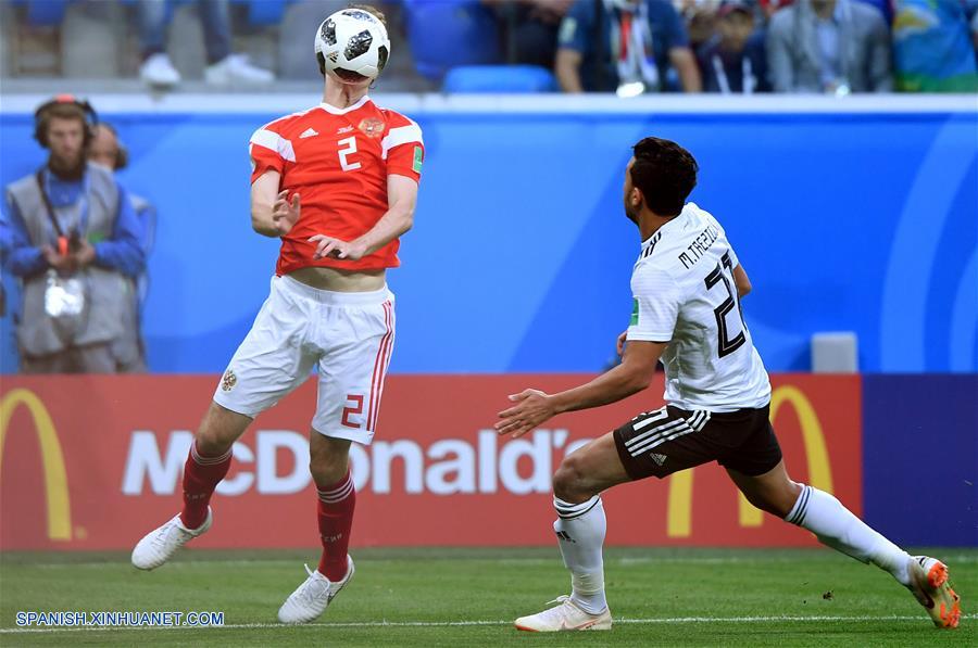 El jugador Mario Fernandes (i), de Rusia, disputa el balón con Trezeguet (d), de Egipto, durante el partido del Grupo A de la Copa Mundial de la FIFA Rusia 2018, en San Petersburgo, Rusia, el 19 de junio de 2018. (Xinhua/Li Ga)