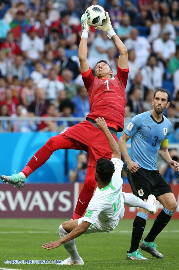 ROSTOV DEL DON, junio 20, 2018 (Xinhua) -- El guardameta Fernando Muslera (arriba), de Uruguay, ataja el balón durante el partido del Grupo A de la Copa Mundial de la FIFA Rusia 2018, ante Arabia Saudita, en Rostov del Don, Rusia, el 20 de junio de 2018. (Xinhua/Li Ming)