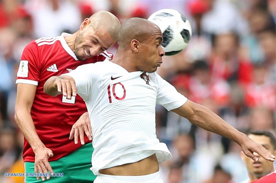 MOSCU, junio 20, 2018 (Xinhua) -- El jugador Joao Mario (d), de Portugal, disputa el balón con Nabil Dirar (i), de Marruecos, durante el partido del Grupo B de la Copa Mundial de la FIFA Rusia 2018, en Moscú, Rusia, el 20 de junio de 2018. (Xinhua/Cao Can)