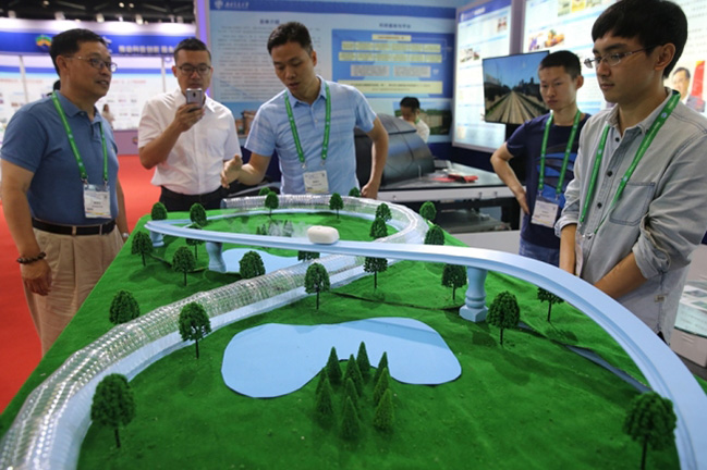Los visitantes observan el modelo de un tubo superconductor que se exhibe en la Convención Mundial del Transporte 2018, Beijing, 19 de junio del 2018. [Foto: China Daily]