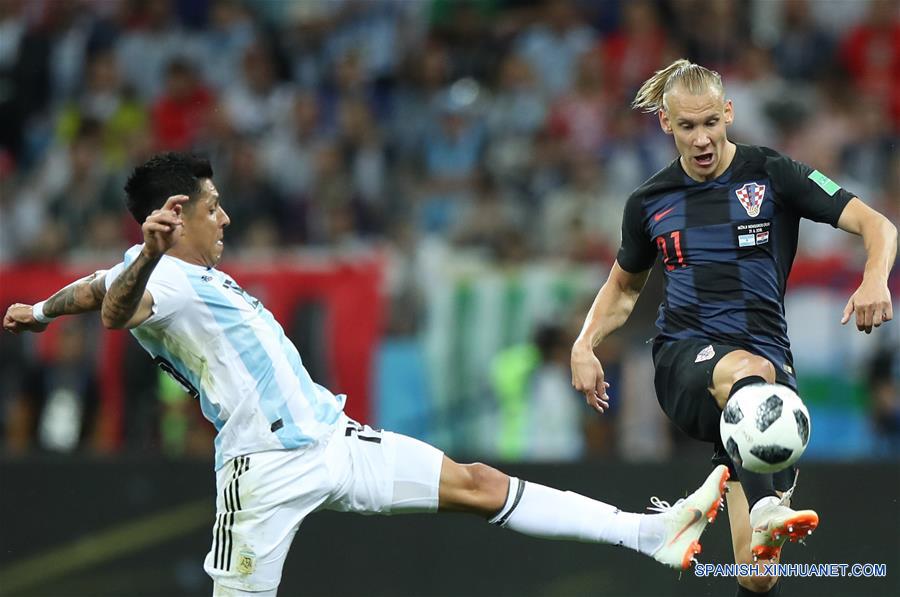 El jugador Enzo Pérez (i), de Argentina, disputa el balón con Domagoj Vida (d), de Croacia, durante el partido del Grupo D de la Copa Mundial de la FIFA Rusia 2018, en Nizhny Novgorod, Rusia, el 21 de junio de 2018. (Xinhua/Wu Zhuang)