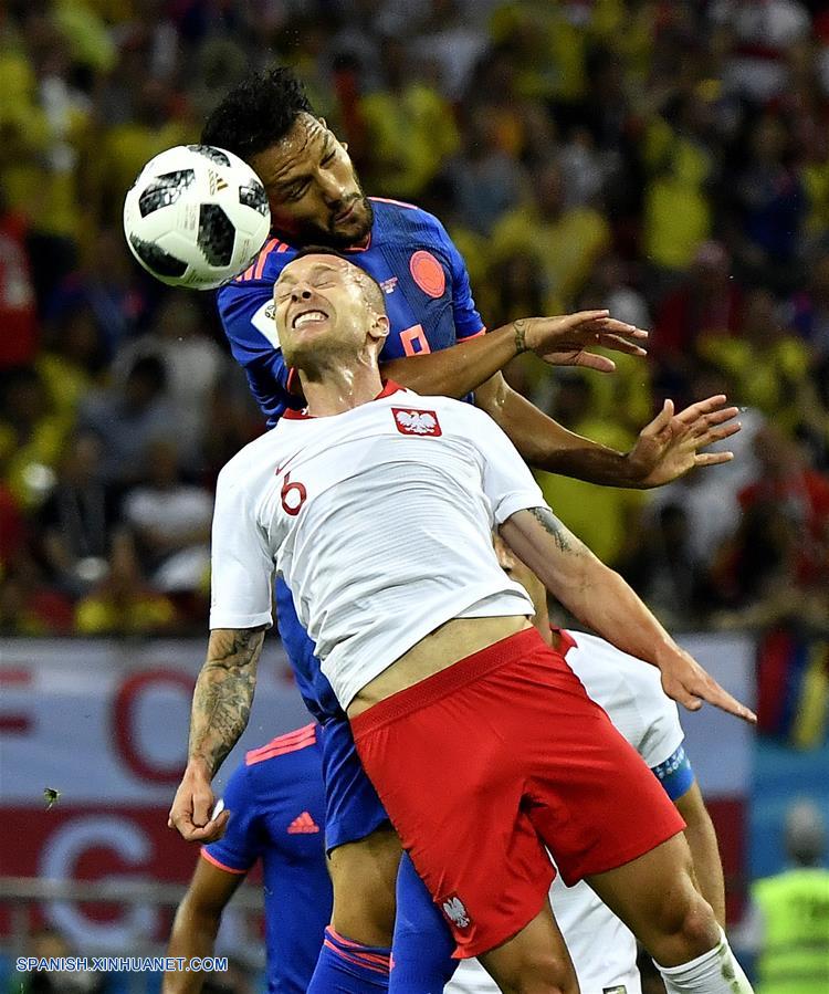 El jugador Jacek Goralski (frente), de Polonia, disputa el balón durante el partido del Grupo H de la Copa Mundial de la FIFA Rusia 2018, ante Colombia, en Kazán, Rusia, el 24 de junio de 2018. (Xinhua/He Canling)
