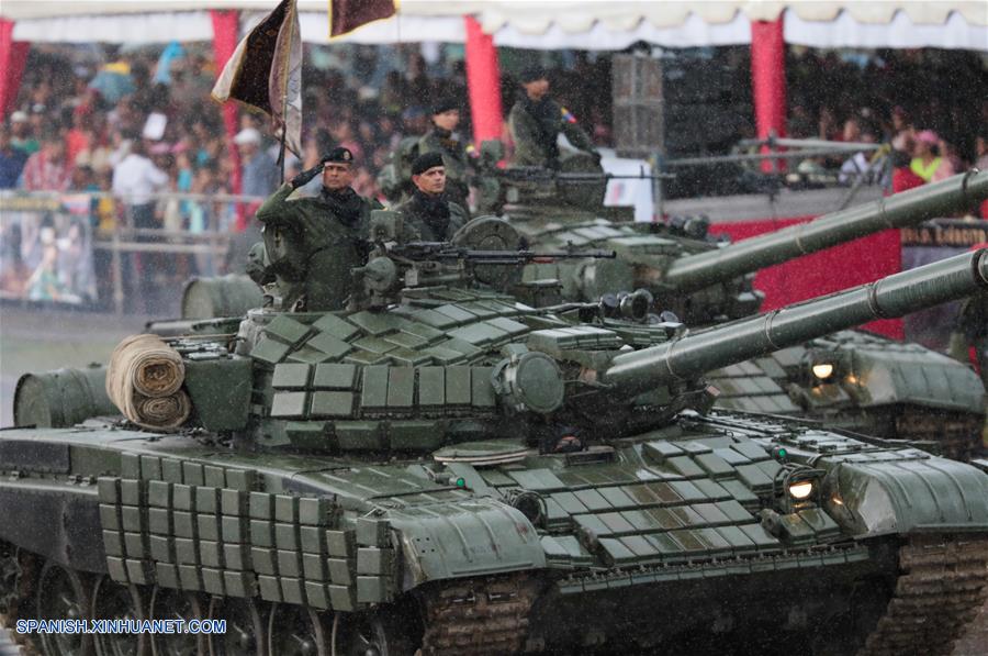 Imagen cedida por la Presidencia de Venezuela de elementos de la Fuerza Armada Nacional Bolivariana (FANB), participando en el acto conmemorativo por el 197 aniversario de la Batalla de Carabobo y día del Ejército Nacional Bolivariano, en el Campo Carabobo, en Carabobo, Venezuela, el 24 de junio de 2018. El presidente de Venezuela, Nicolás Maduro, alertó el domingo sobre una operación en contra del país, desde Bogotá, por parte de políticos y militares retirados, por lo que llamó a la Fuerza Armada Nacional Bolivariana (FANB) a cuidar la capacidad de defensa de la patria. El mandatario venezolano hizo esta afirmación durante el desfile cívico militar en conmemoración de los 197 a?os de la Batalla de Carabobo y el Día del Ejército Nacional Bolivariano. (Xinhua/Presidencia de Venezuela)