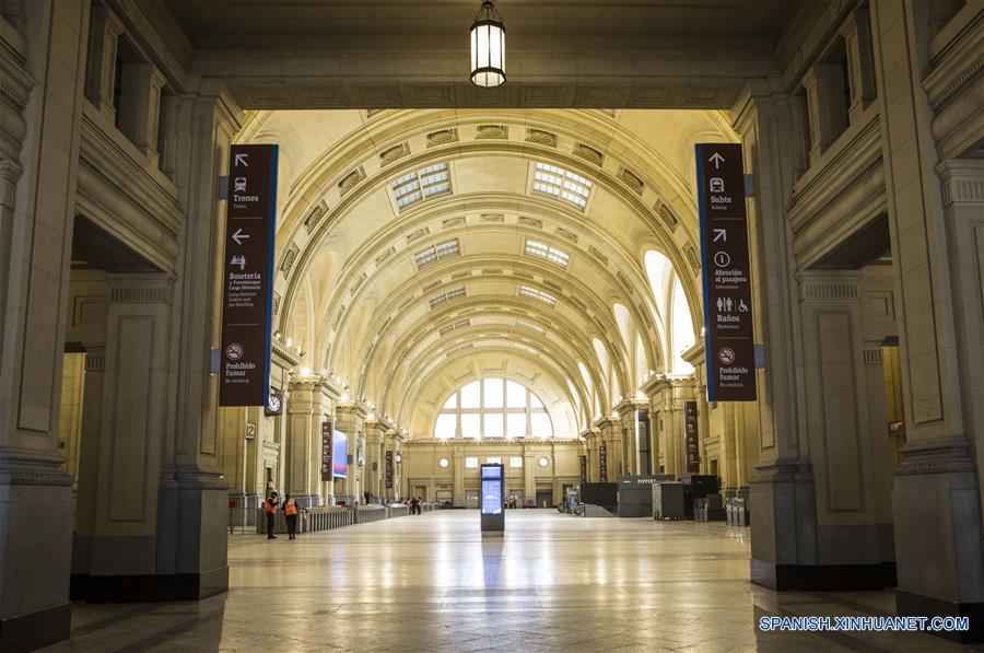 Guardias de seguridad vigilan la estación ferroviaria Constitución mientras permanece cerrada durante una huelga general, en Buenos Aires, capital de Argentina, el 25 de junio de 2018. Una huelga general de 24 horas, convocada por la Confederación General del Trabajo (CGT) en reclamo de mejoras salariales y en rechazo a la política económica del gobierno argentino, se inició el lunes en todo el país desde las 00:00 horas. (Xinhua/Martín Zabala)