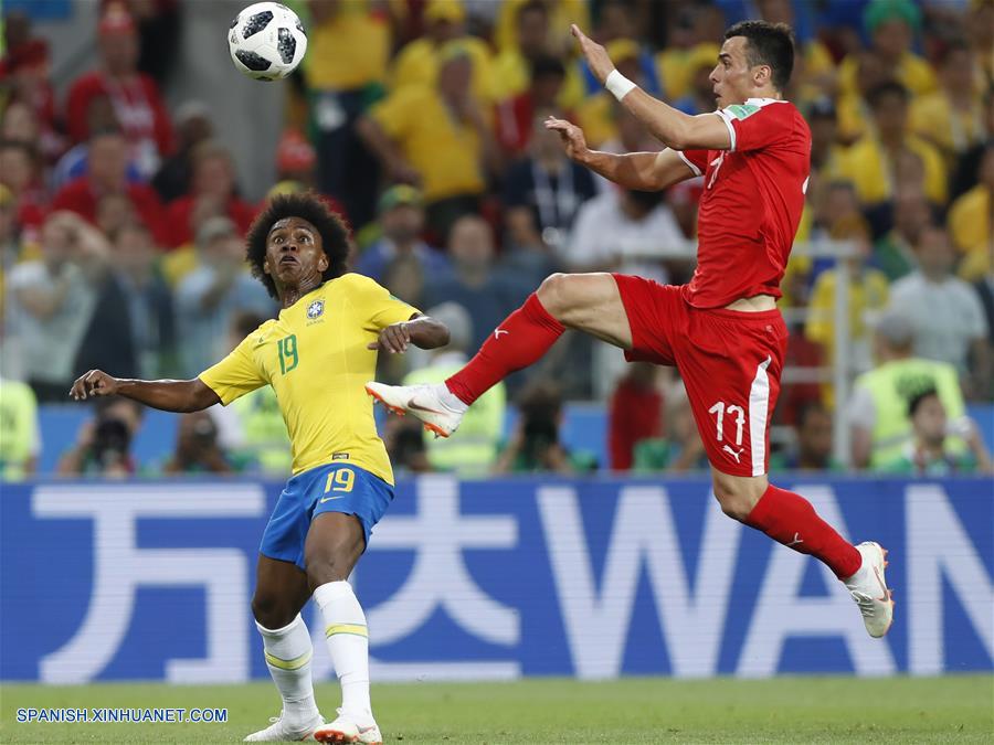 El jugador Filip Kostic (d), de Serbia, disputa el balón con Willian (i), de Brasil, durante el partido del Grupo E de la Copa Mundial de la FIFA Rusia 2018, en Moscú, Rusia, el 27 de junio de 2018. (Xinhua/Cao Can)