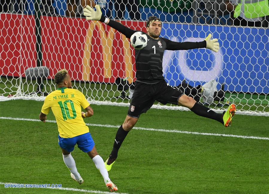 El guardameta Vladimir Stojkovic (d), de Serbia, disputa el balón con Neymar (i), de Brasil, durante el partido del Grupo E de la Copa Mundial de la FIFA Rusia 2018, en Moscú, Rusia, el 27 de junio de 2018. (Xinhua/Wang Yuguo)