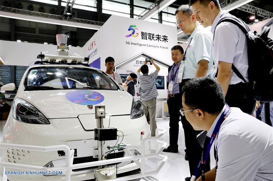 SHANGHAI, junio 27, 2018 (Xinhua) -- Visitantes observan un dispositivo de red inalámbrico en un automóvil sin conductor durante el Congreso Mundial de Móviles de Shanghai (MWCS, por sus siglas en inglés) 2018, en Shanghai, en el este de China, el 27 de junio de 2018. El MWCS 2018 de tres días de duración comenzó el miércoles en el Nuevo Centro Internacional de Exposiciones de Shanghai, mostrando tendencias de productos, servicios y tecnologías móviles. (Xinhua/Fang Zhe)