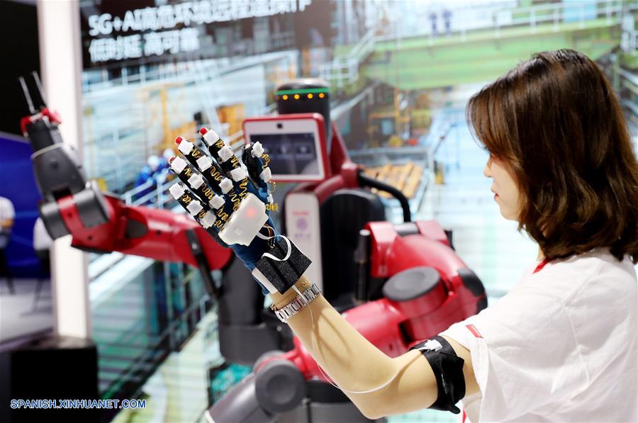 SHANGHAI, junio 27, 2018 (Xinhua) -- Una empleada muestra un control remoto con tecnología 5G e inteligencia artificial (IA) durante el Congreso Mundial de Móviles de Shanghai (MWCS, por sus siglas en inglés) 2018, en Shanghai, en el este de China, el 27 de junio de 2018. El MWCS 2018 de tres días de duración comenzó el miércoles en el Nuevo Centro Internacional de Exposiciones de Shanghai, mostrando tendencias de productos, servicios y tecnologías móviles. (Xinhua/Fang Zhe)