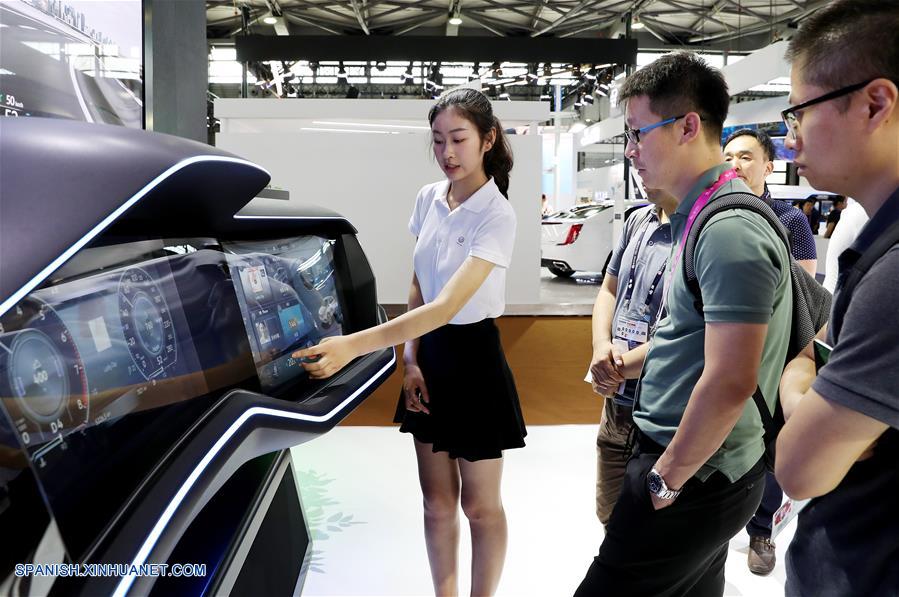 SHANGHAI, junio 27, 2018 (Xinhua) -- Visitantes observan un tablero de automóvil interactivo que utiliza tecnología de red inalámbrica durante el Congreso Mundial de Móviles de Shanghai (MWCS, por sus siglas en inglés) 2018, en Shanghai, en el este de China, el 27 de junio de 2018. El MWCS 2018 de tres días de duración comenzó el miércoles en el Nuevo Centro Internacional de Exposiciones de Shanghai, mostrando tendencias de productos, servicios y tecnologías móviles. (Xinhua/Fang Zhe)