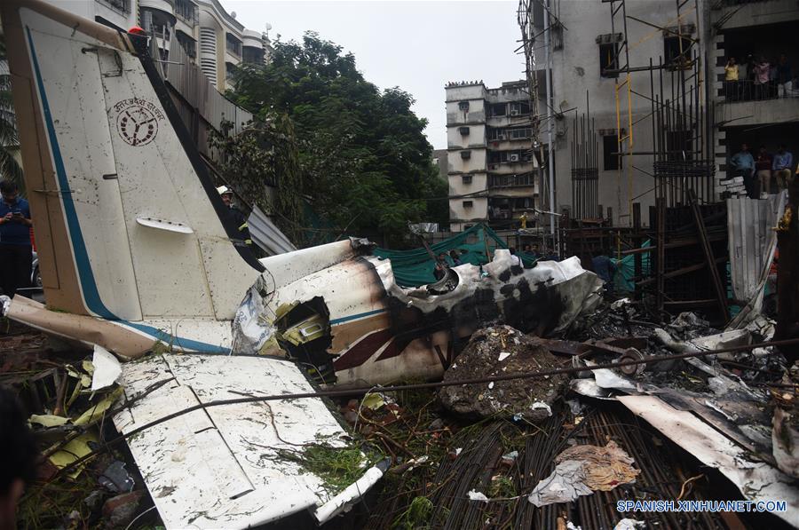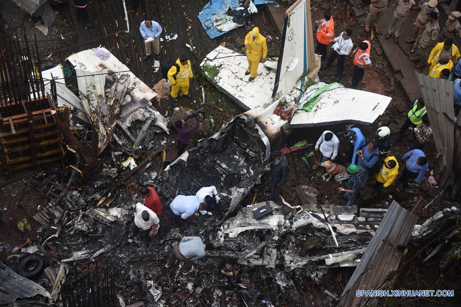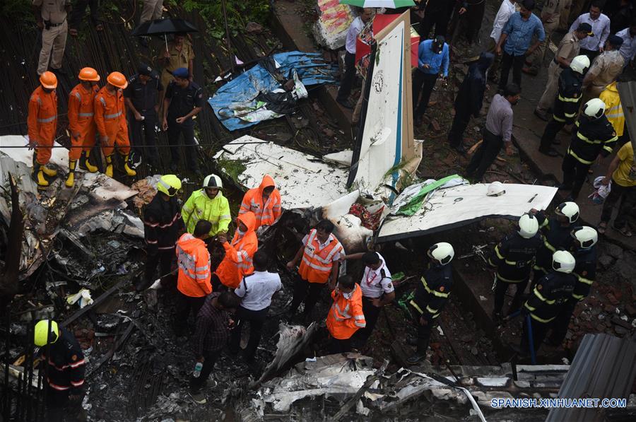 MUMBAI, junio 28, 2018 (Xinhua) -- Rescatistas se reúnen en torno a los restos de un avión que se estrelló en un área abierta adyacente a un edificio en construcción, en Mumbai, India, el 28 de junio de 2018. Al menos cinco personas murieron al estrellarse un avión chárter del gobierno estatal en el que viajaban el jueves en la ciudad india de Mumbai, informó la policía. (Xinhua/Str)