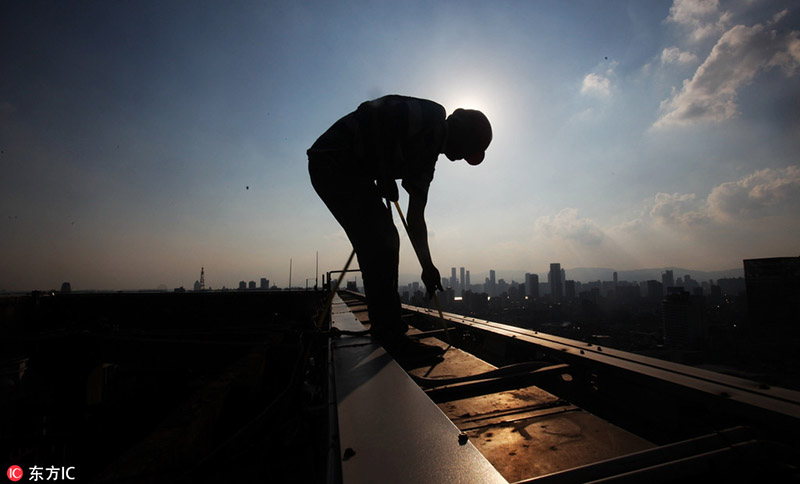 Chen Zhenzhen, de 29 a?os e hijo de Chen Maoqing, limpia la fachada de un edificio en Nanchang, provincia de Jiangxi, 28 de junio del 2018. [Foto: IC]
