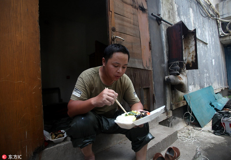 Chen Zhenzhen almuerza durante una pausa en la jornada laboral. Nanchang, provincia de Jiangxi, 28 de junio del 2018. [Foto: IC]