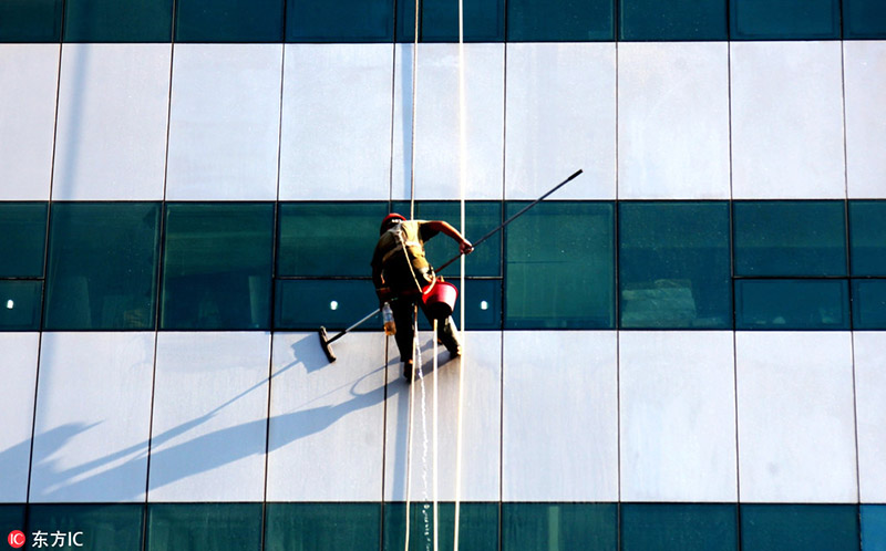 Nanchang, Jiangxi, 29/06/2018 (El Pueblo en Línea) - Maoqing limpia la fachada de un edificio de 110 metros de altura bajo el intenso calor del fuerte sol del verano. "Cuando limpiamos la fachada de los edificios, estamos a 100 metros de altura y el sol incide directamente en mi cabeza", afirma Cheng Maoqing, quien ha trabajado como limpiador de fachadas de edificios durante 10 a?os. "La fachada y el vidrio del edificio se ponen tan calientes que pueden llegar a los 40 grados celsius". Nanchang, provincia de Jiangxi, 28 de junio del 2018. [Foto: IC]