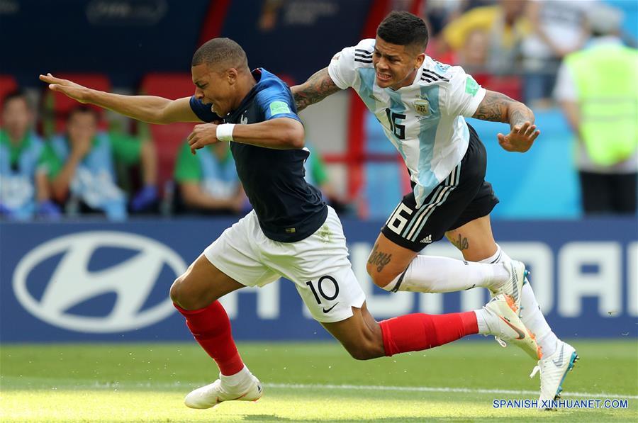 El jugador Kylian Mbappe (i), de Francia, recibe una falta de parte de Marcos Rojo (d), de Argentina, durante el partido de octavos de final de la Copa Mundial de la FIFA Rusia 2018, en Kazán, Rusia, el 30 de junio de 2018. (Xinhua/Lu Jinbo)